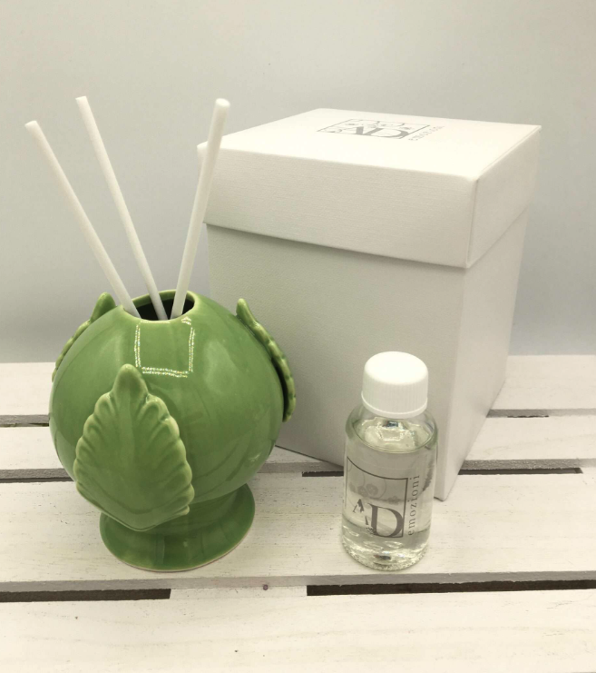 Il profumatore a forma di “pumo” della Linea “I nuovi Pomi”, di AD Emozioni è realizzato in ceramica lucida in 7 varianti di colori. La bomboniera include oltre al profumatore, 3 bastoncini in legno, la fragranza e la scatola. La pigna è circondata da foglie d’acanto che simboleggiano la primavera, la rinascita, l’energia, il rinnovamento, ed è considerata un simbolo di vita nuova e di buon augurio.